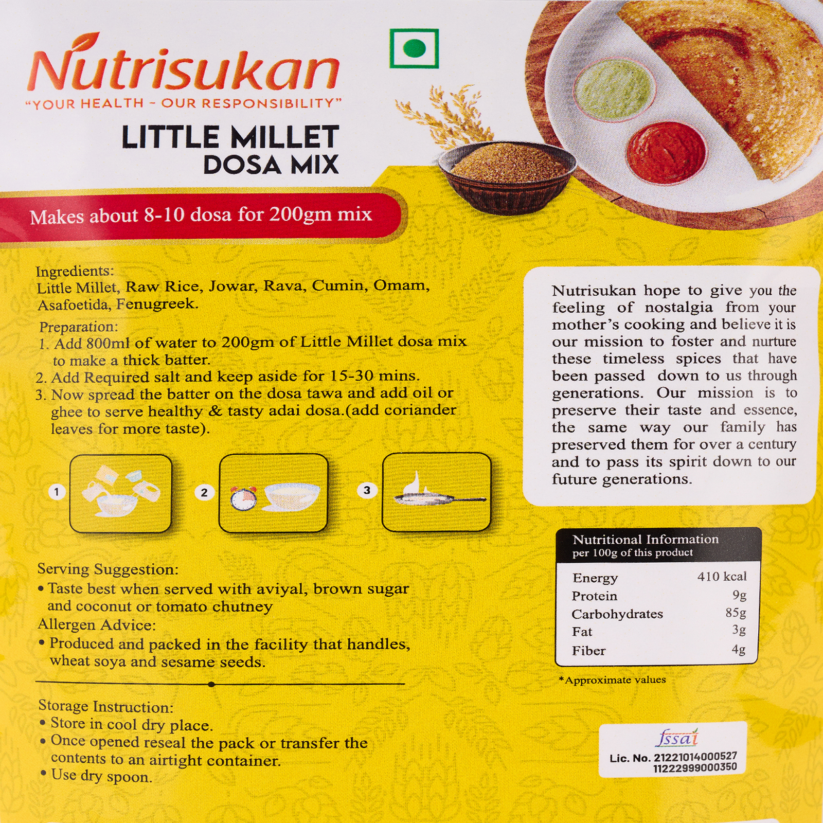 Nutrisukan Little Millet Dosa Mix is a convenient and nutritious way to make delicious dosa. It contains rich source of proteins, vitamins and minerals. Enjoy a tasty meal without all the hassle.